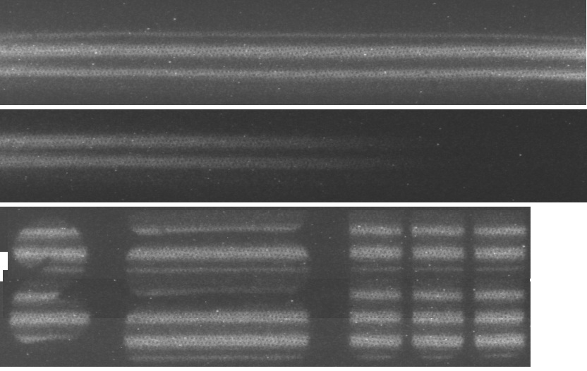 Composite image of test pattern grids: top, 50-micron bar magnified 1.6X, middle, edge of multilayer reflection illumination field, bottom, overlay of near-detector pattern as check on image distortion.